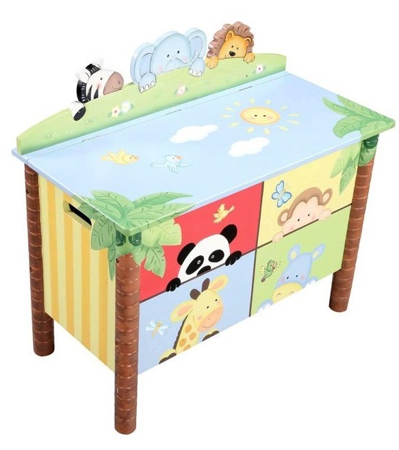 Here’s another box idea that’s popping with charm and style. The children’s story book style design of this toy chest sets it aside from the others and it’s also a really good price. Bright, modern style illustrations cover the front, sides and upper panels of this unit and its also fine to use as a seat.